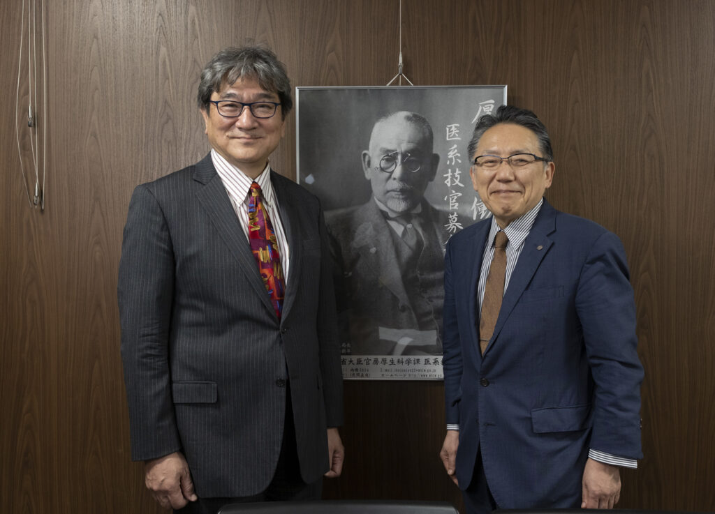 の前に立つ迫井医務技監(左)と神野全日病会長=厚労省医務技監室